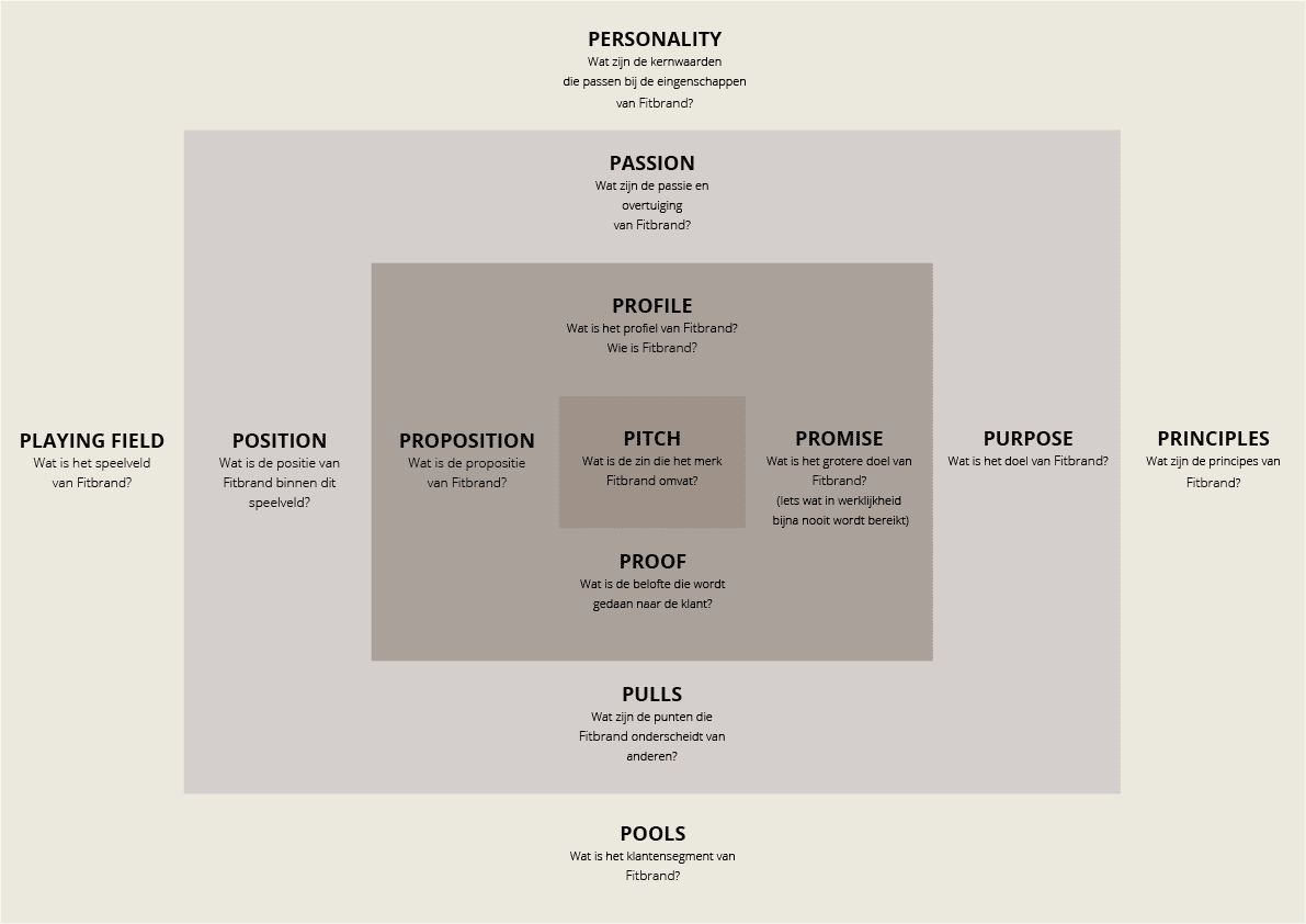 Playing Fields: Wat is het speelveld van de onderneming? Oftewel: wat is je markt? (Fitness, vervoer, elektronica etc.) Personality: Wat zijn de kern of merkwaarden / welke persoonlijkheid heeft de onderneming? Principles: Voor welke principes staat de onderneming? (betrouwbaarheid, kwaliteit etc.) Pools: Wat is het klantensegment van de onderneming?