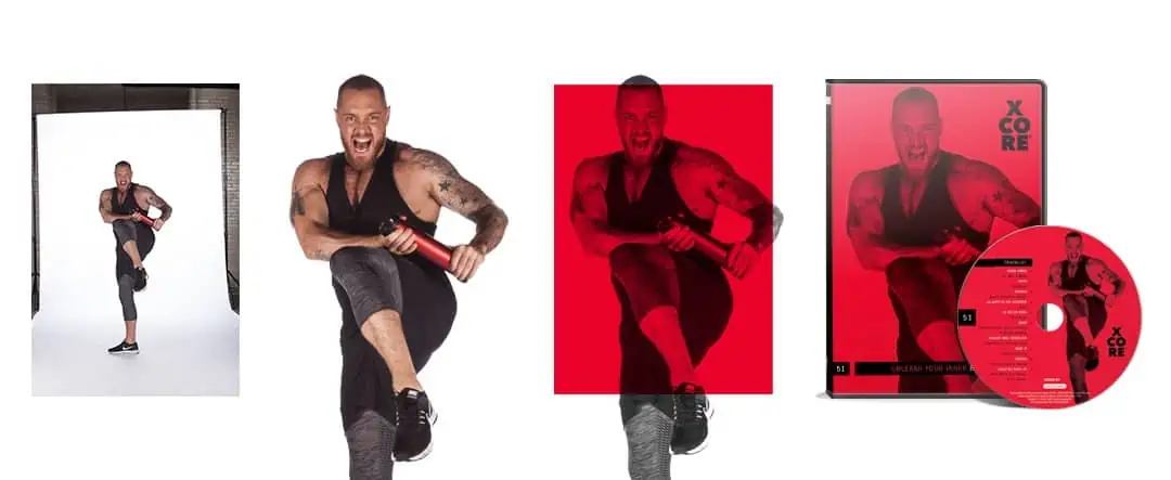 vlnr: XCORE: onbewerkte foto, vrijstaand en colour-grading, eindresultaat op DVD front en hoes